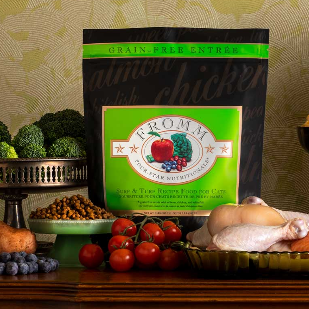 Fromm Four-Star Surf & Turf Recipe is an exquisite, grain-free blend of salmon, chicken, and whitefish. This recipe is specially prepared to ensure consistency, quality, and superior taste in each and every bowl. Surf & Turf Recipe cat food provides complete and balanced nutrition for cats of all ages and can be alternated with other Fromm Four-Star recipes.
