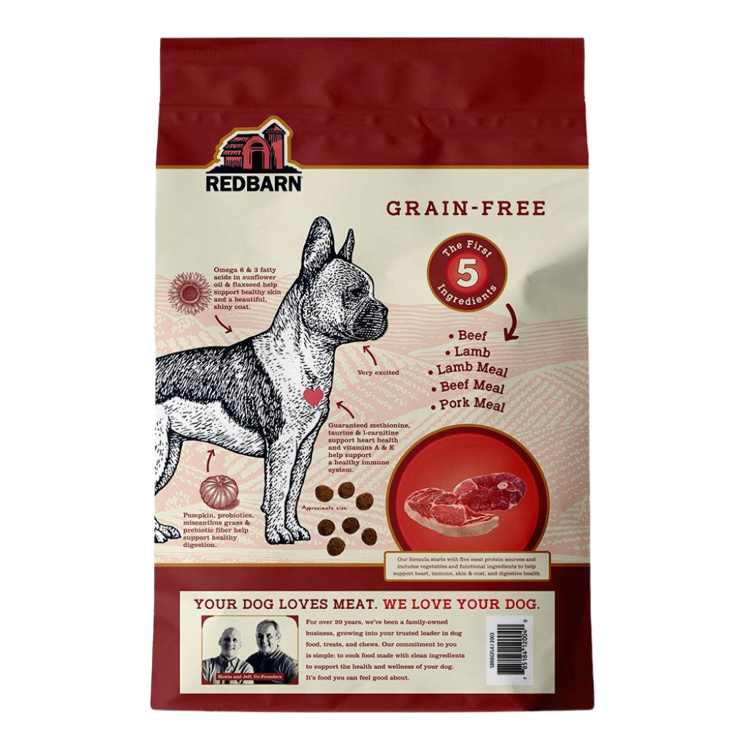 If your dog loves meat, they’ll love Redbarn’s Grain-Free dry dog food. The first FIVE ingredients in all three recipes are meat, fish, or poultry, depending on the recipe. Animal protein is the best source of protein for our pups, and these Grain-Free recipes will help support your dog’s overall health, wellness, and longevity into their senior years. But the goodness doesn’t stop there— each scoop of dry food contains carefully selected functional ingredients. Pumpkin, prebiotics, and probiotics help support healthy digestion; sunflower oil and flaxseed support healthy skin and a beautiful, shiny coat; and guaranteed levels of taurine, l-carnitine, and methionine support heart health. It’s your dog’s new, well-balanced nutrition plan in a few convenient scoops! For over 20 years, Redbarn Pet Products has been a family-owned business, growing into your trusted leader in treats, chews, and food. From then through now, Redbarn’s commitment to pet parents is simple: to cook food made with clean ingredients to support the health and wellness of your dog. It’s food we all feel good about.